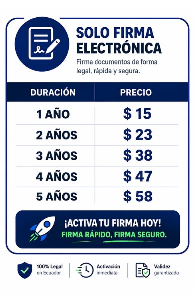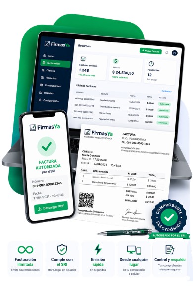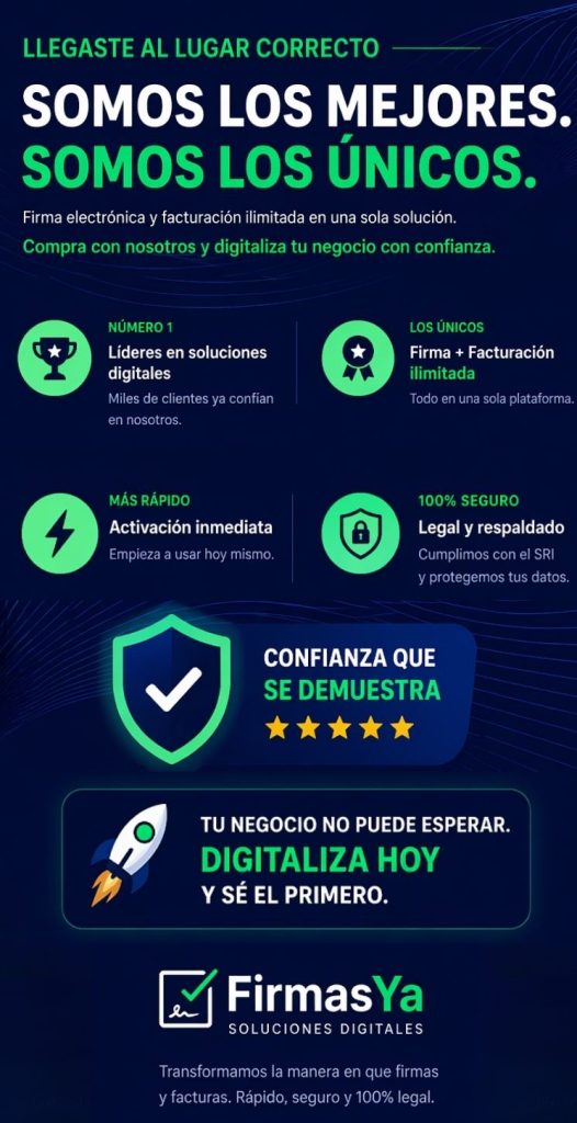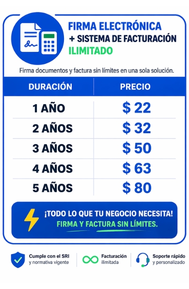 Accede a firma electrónica y facturación ilimitada en una sola solución. Optimiza tus procesos, ahorra tiempo y cumple con la normativa ecuatoriana de forma rápida, segura y sin complicaciones.